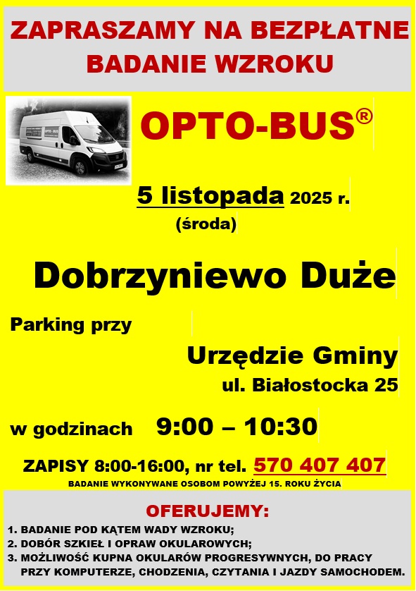 Już w środę, 5 listopada 2025 roku, mieszkańcy Dobrzyniewa Dużego i okolic będą mieli okazję skorzystać z bezpłatnych badań wzroku. Mobilny punkt diagnostyczny OPTO-BUS zaparkuje na parkingu przy Urzędzie Gminy (ul. Białostocka 25) i będzie dostępny w godzinach 9:00–10:30.