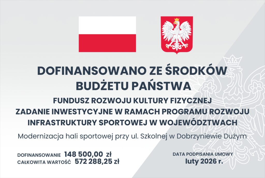 Dodatkowo w dniu 16.02.2026 r. podpisano umowę o dofinansowanie w/w Inwestycji z Ministerstwem Sportu i Turystyki w ramach środków z Funduszu Rozwoju Kultury Fizycznej zadania inwestycyjnego w ramach Programu Rozwoju Infrastruktury Sportowej w województwach.