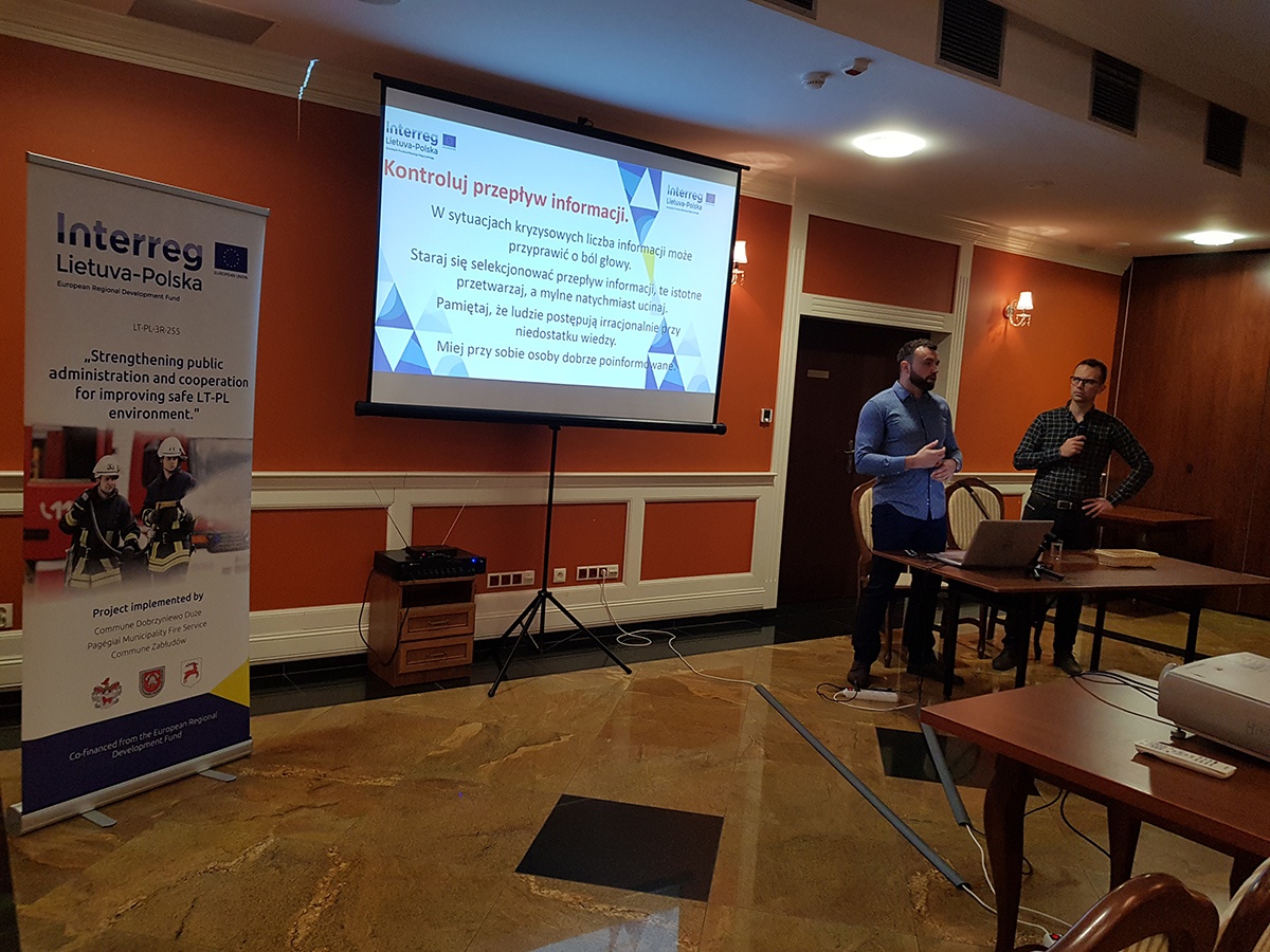 „Implementation of fire and accident prevention measures” is another of a series of trainings conducted for residents of the Dobrzyniewo Duże commune as part of the project entitled „Strengthening public administration and cooperation for improving safe LT-PL environment.” No. LT-PL-3R-255.